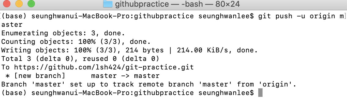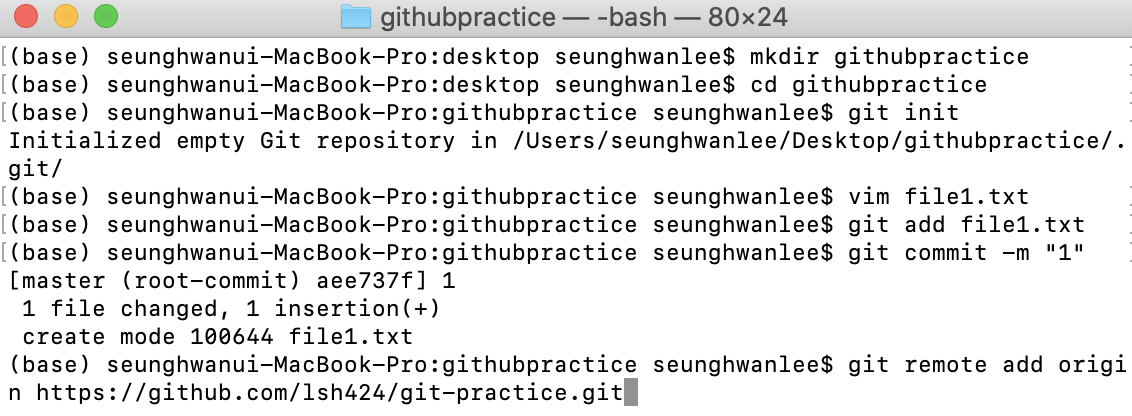 저의 경우 git remote add origin https://github.com/lsh424/git-practice.git 이 되겠네요.