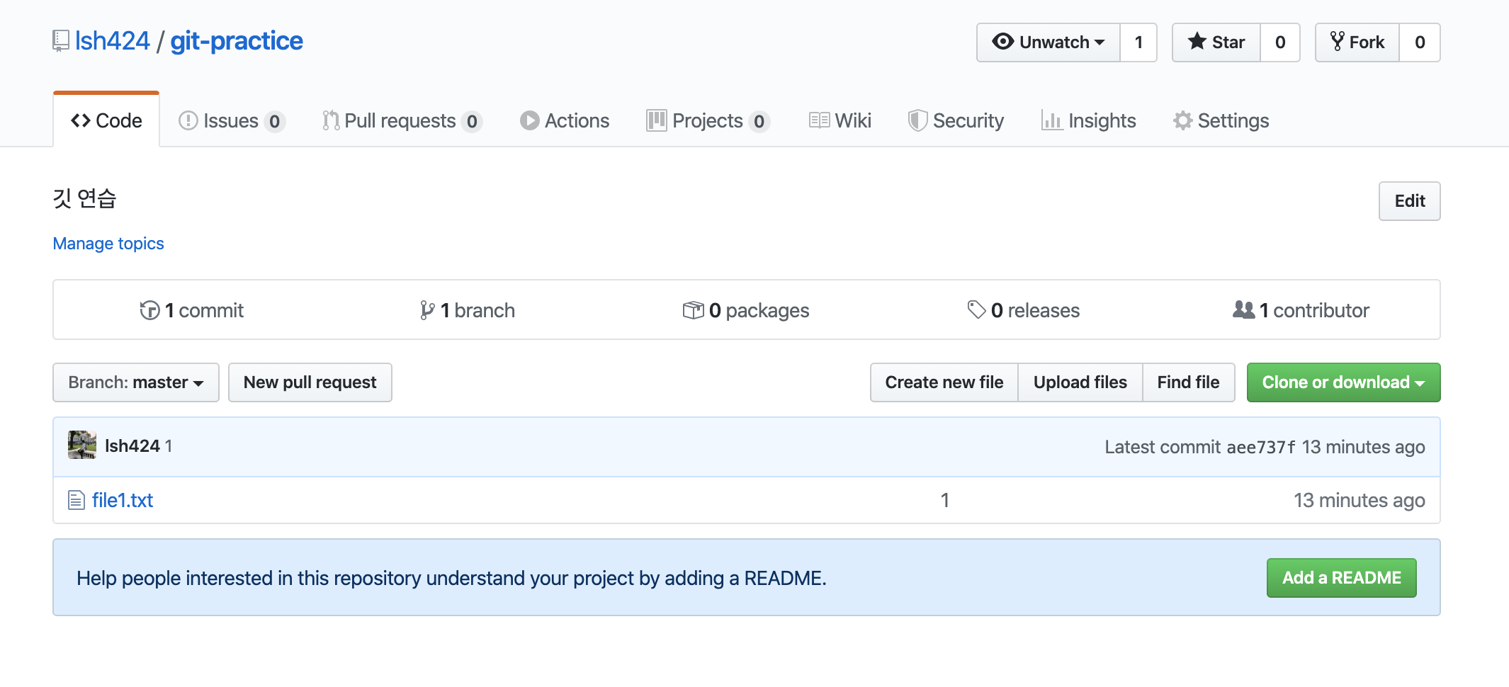 저는 githubpractice 라는 새로운 디렉토리를 만들고 텍스트파일을 만들어서 git add와 git commit을 해주겠습니다. (텍스트 파일 내용은 마음대로 하셔도 좋습니다! 예전부터 그래왔듯이 텍스트파일 = 프로젝트파일로 가정하고 진행하시는거 알죠?)