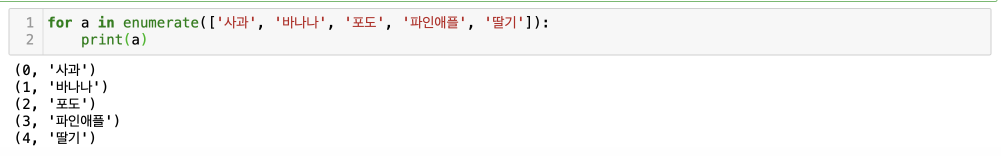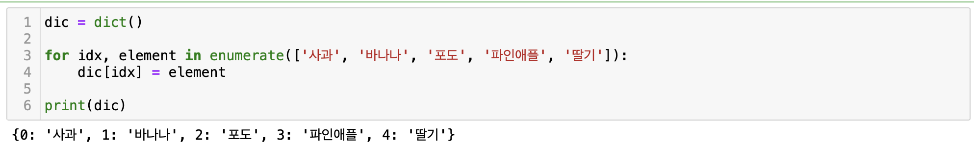 enumerate함수는 다음과 같이 튜플을 반환하는데, 이 enumerate 함수를 사용하여 리스트의 인덱스를 key값으로 하는 딕셔너리를 만들 수 있습니다.