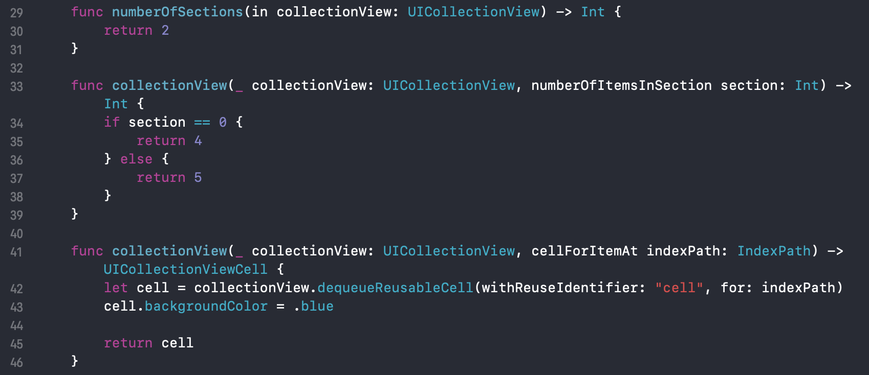 아까 섹션을 두 개 만든다고 했었죠? 그래서, 섹션이 0 일때는 셀을 4개 반환하고 섹션이 1일때는 셀을 5개 반환하도록 설정 했습니다. 그리고 셀과 배경색을 구분하기 위해 배경색은 파랑으로 설정!
