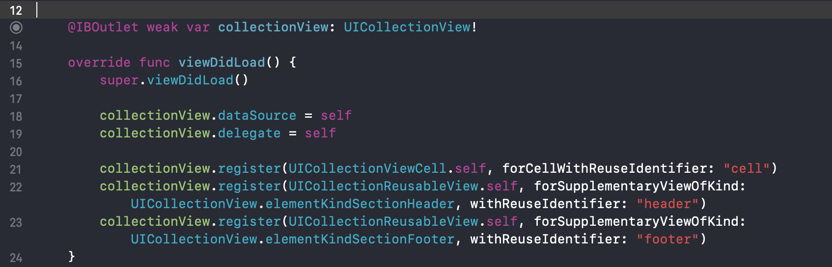 이제 컬렉션뷰를 아울렛으로 연결 해 주시고, viewDidLoad()에 셀과 헤더, 푸터를 register 해줍니다.