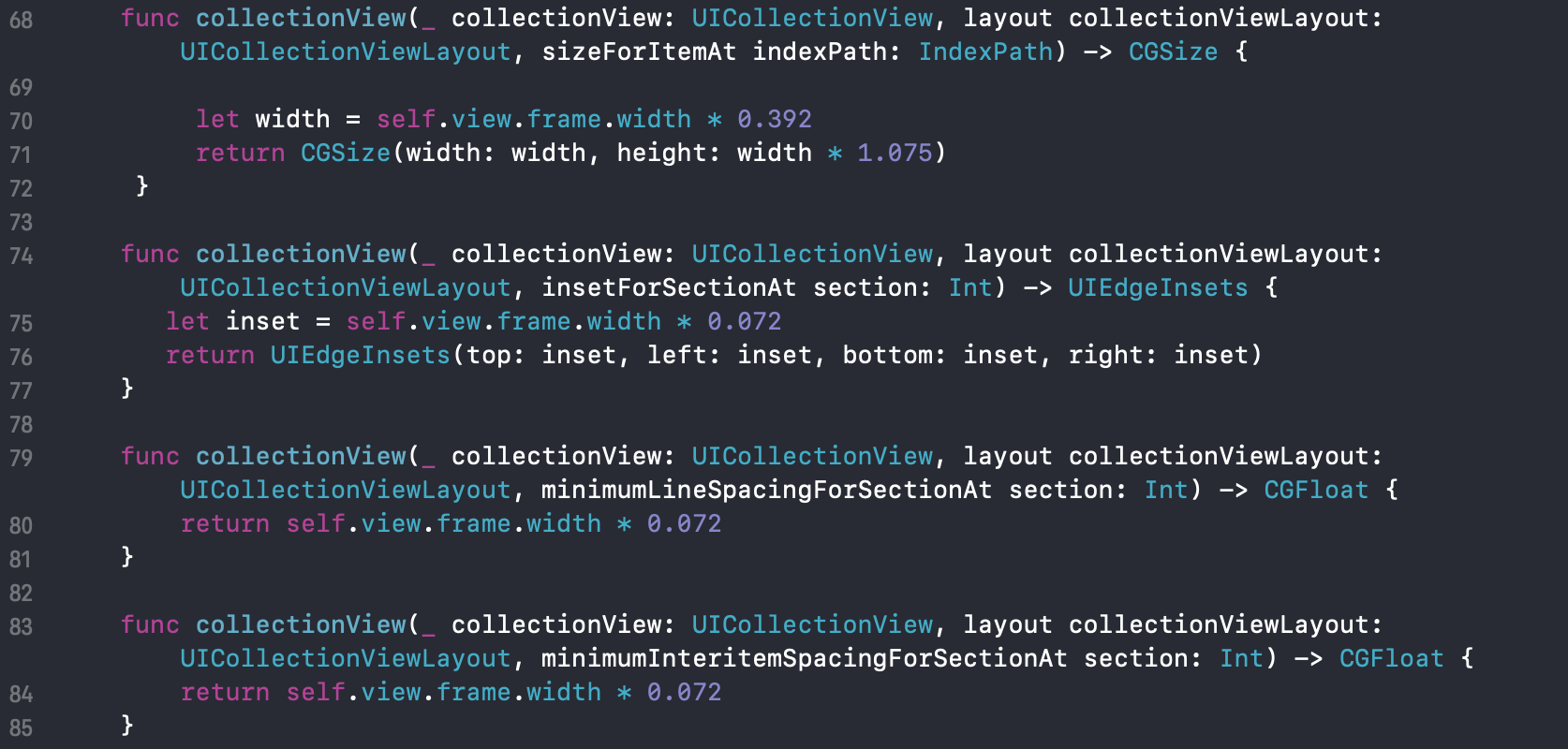 각각 셀의 사이즈, 섹션 인셋, 셀간의 간격, 행간의 간격을 설정하는 코드 입니다. 보시면, 저의 경우 constant한 값을 주지 않고 다 frame.width를 참조하여 비율값으로 주고 있는데요, 그 이유는 여러 기기의 사이즈에 대응하기 위해서 입니다!