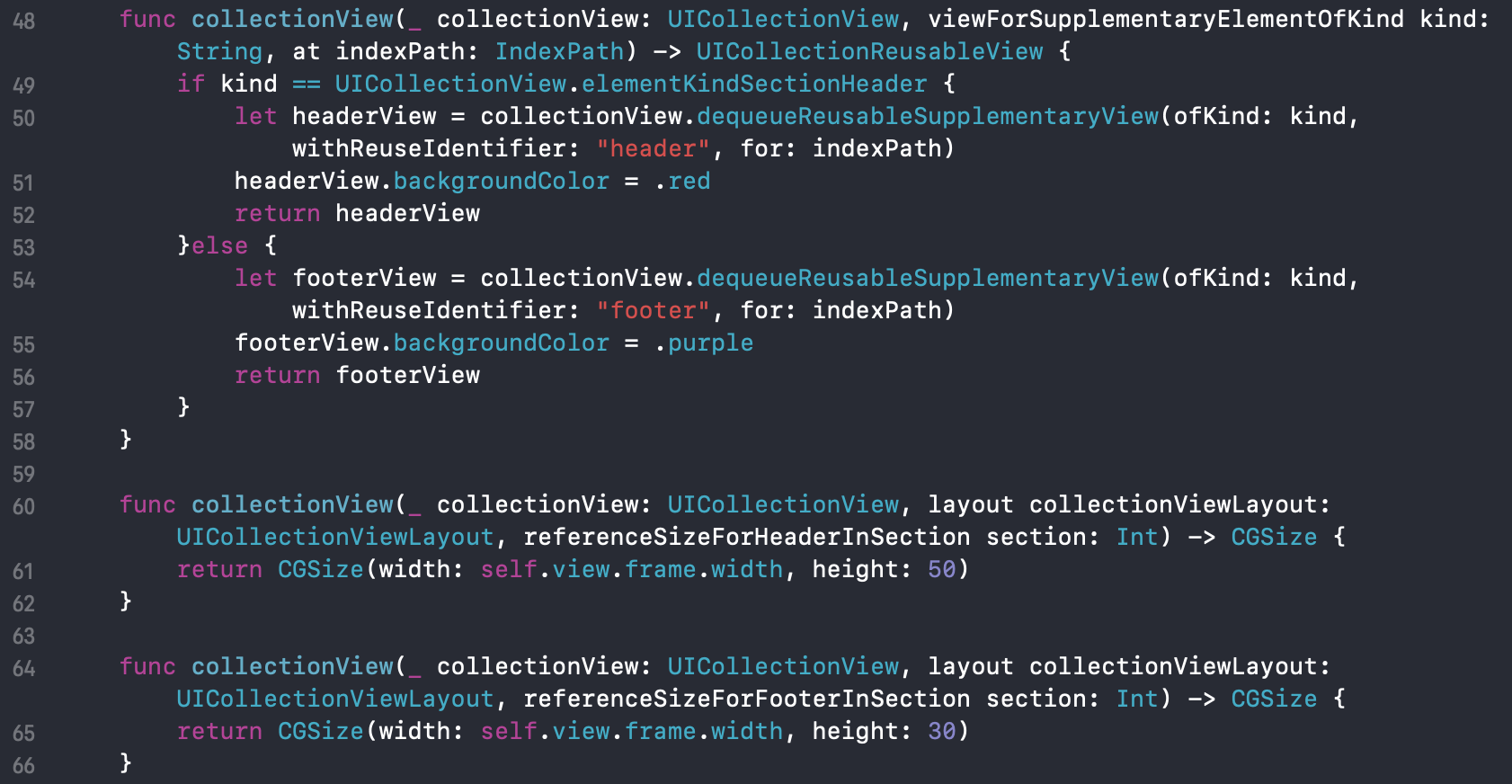 앞서, 헤더뷰와 푸터뷰는 무조건 ReusableView를 사용해야 한다고 했었죠? 그래서 ReusableView를 반환하는 메소드를 채택해서 구현해야합니다. 첫번째 메소드에서 collectionvView와 indexPath는 많이 봐왔던 것들인데, kind는 많이 생소하시죠? 저 kind는 string 타입으로, elementKindSectionHeader와 elementKindSectionFooter로 나뉩니다. 그래서 저는 if문으로 kind에 따라 헤더와 푸터를 반환하도록 구현하였습니다.