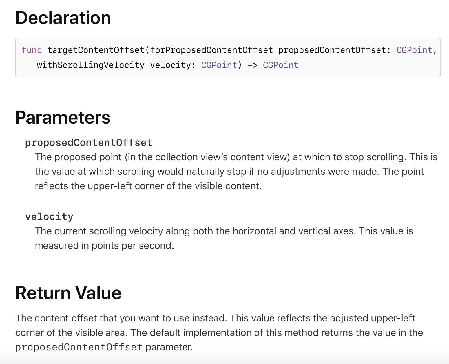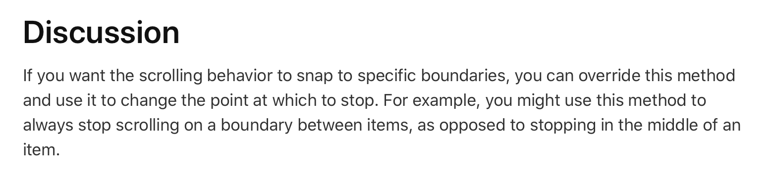 우리는 targetContentOffset 메서드를 오버라이드 해서 사용 할 겁니다. 왜냐?? 애플 개발자 문서에 들어가서 이 메서드에 대한 설명을 보면 이 메서드를 재정의해서 사용하면 스크롤이 중지되는 지점을 변경 할 수 있다고 하거든요!
