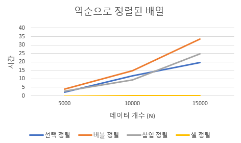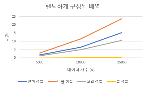 | 데이터 개수(N) | 선택 정렬 | 버블 정렬 | 삽입 정렬 | 셸 정렬 |