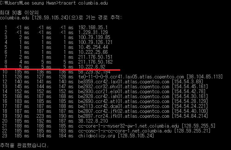 명령 프롬프트 창(cmd)에 다음과 같이 tracert 해외사이트를 쳐보시면되는데요. (저는 뉴욕에 위치한 콜롬비아 대학교 사이트를 입력했습니다.)