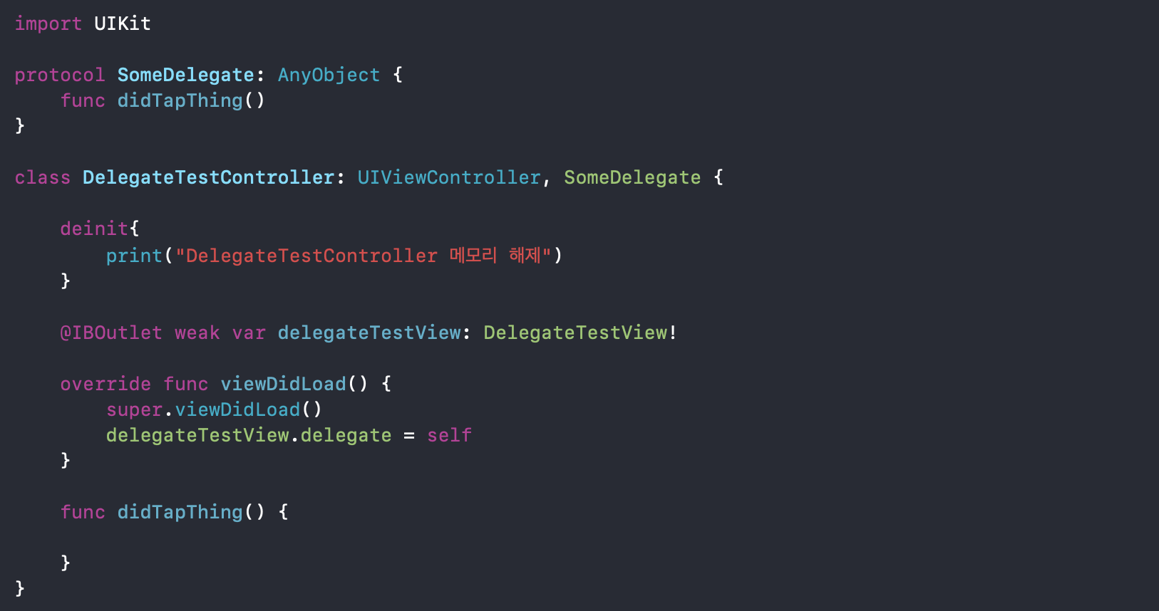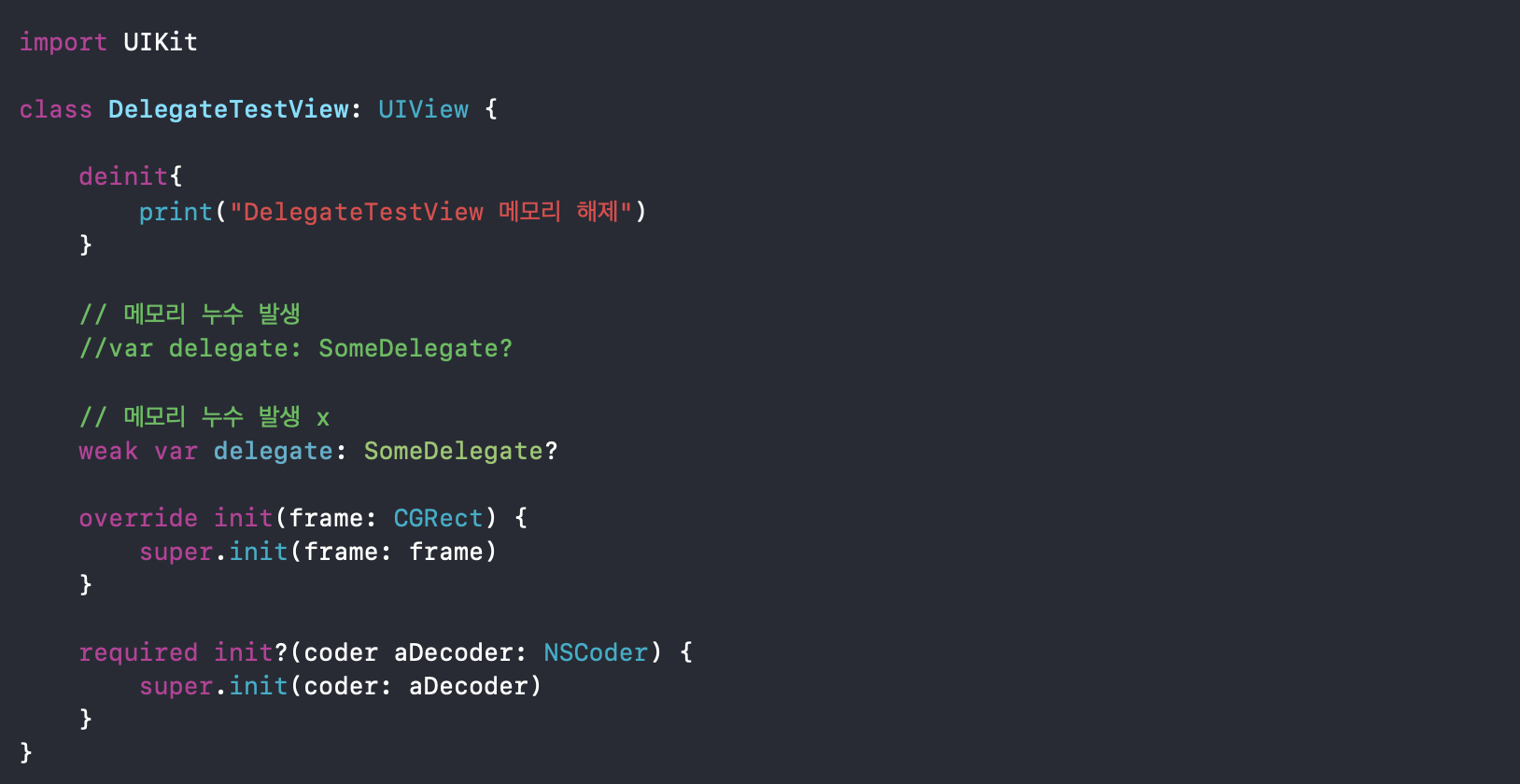 위와 같이 delegate 패턴을 사용한다고 가정할 때, delegate변수를 weak으로 선언하지 않으면 강한 순환 참조가 생기기 때문에DelegateTestController, DelegateTestView 둘 다 메모리에서 해제되지 않습니다.