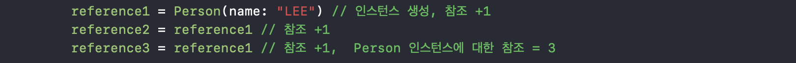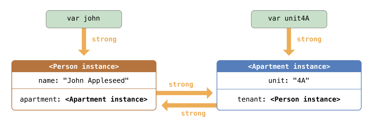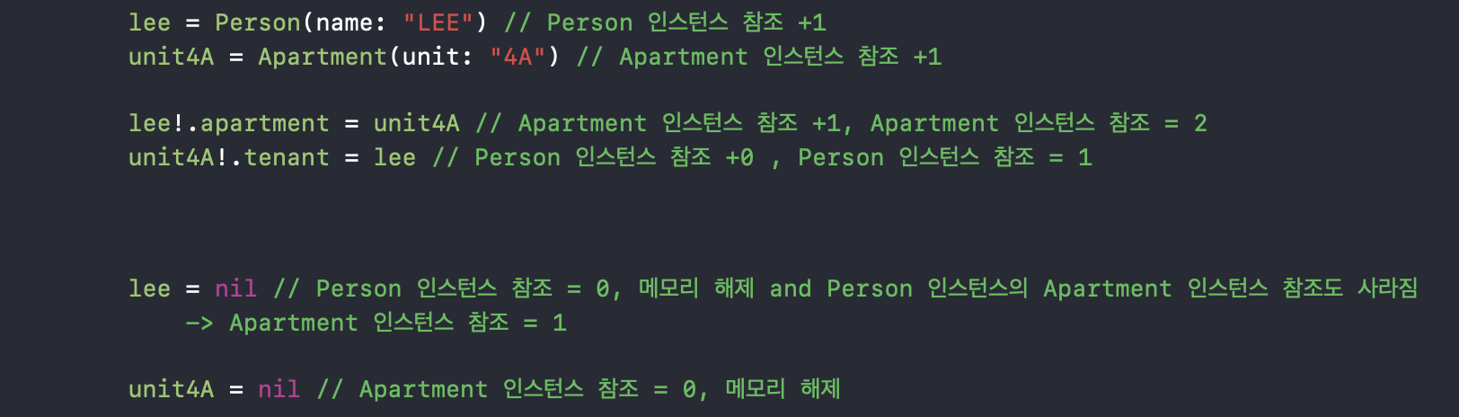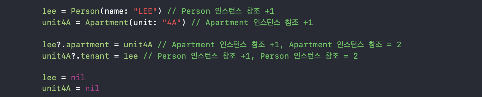 Apartment 인스턴스에 대한 reference count = 2, Person 인스턴스에 대한 Reference count = 1이 되죠.