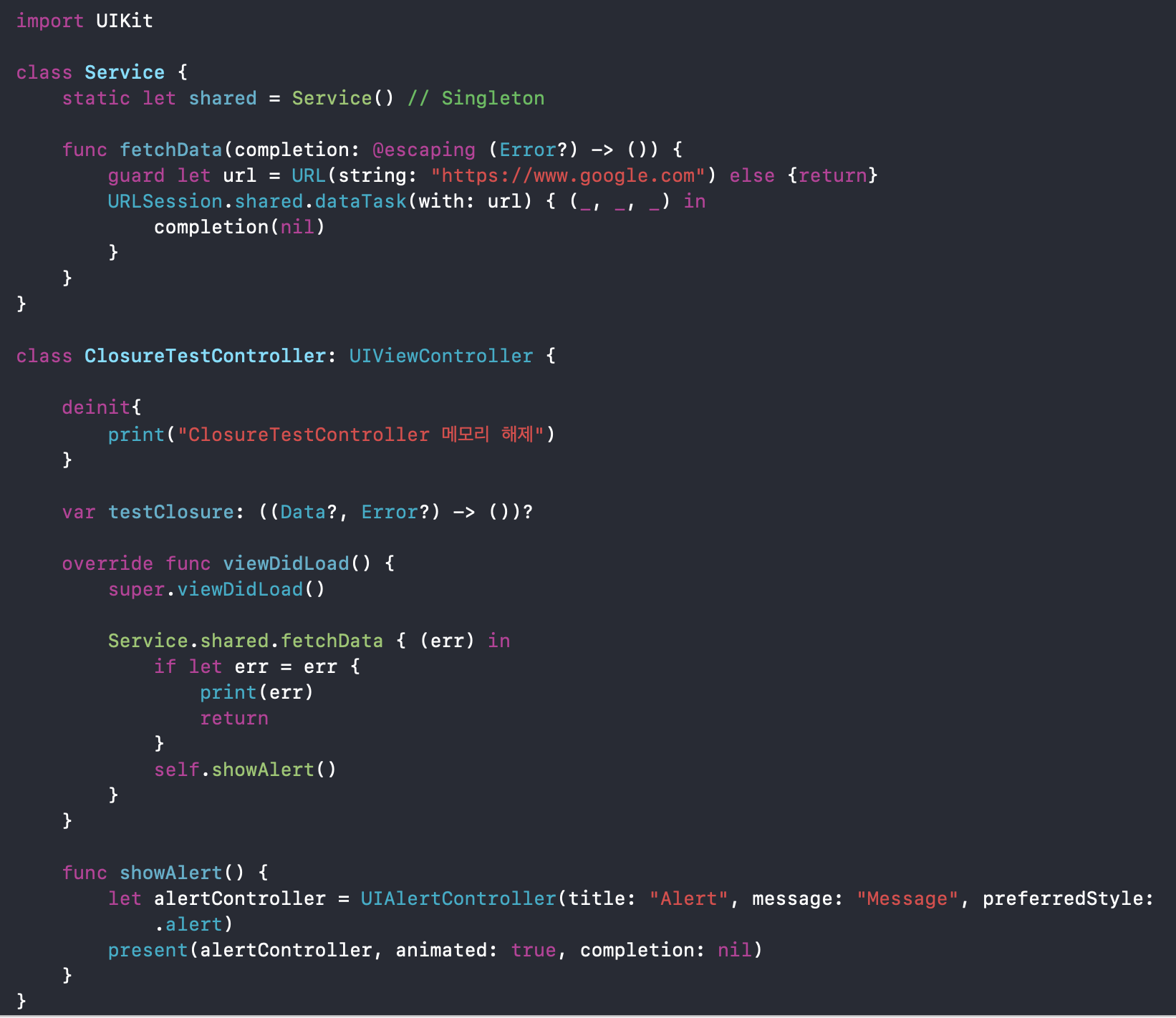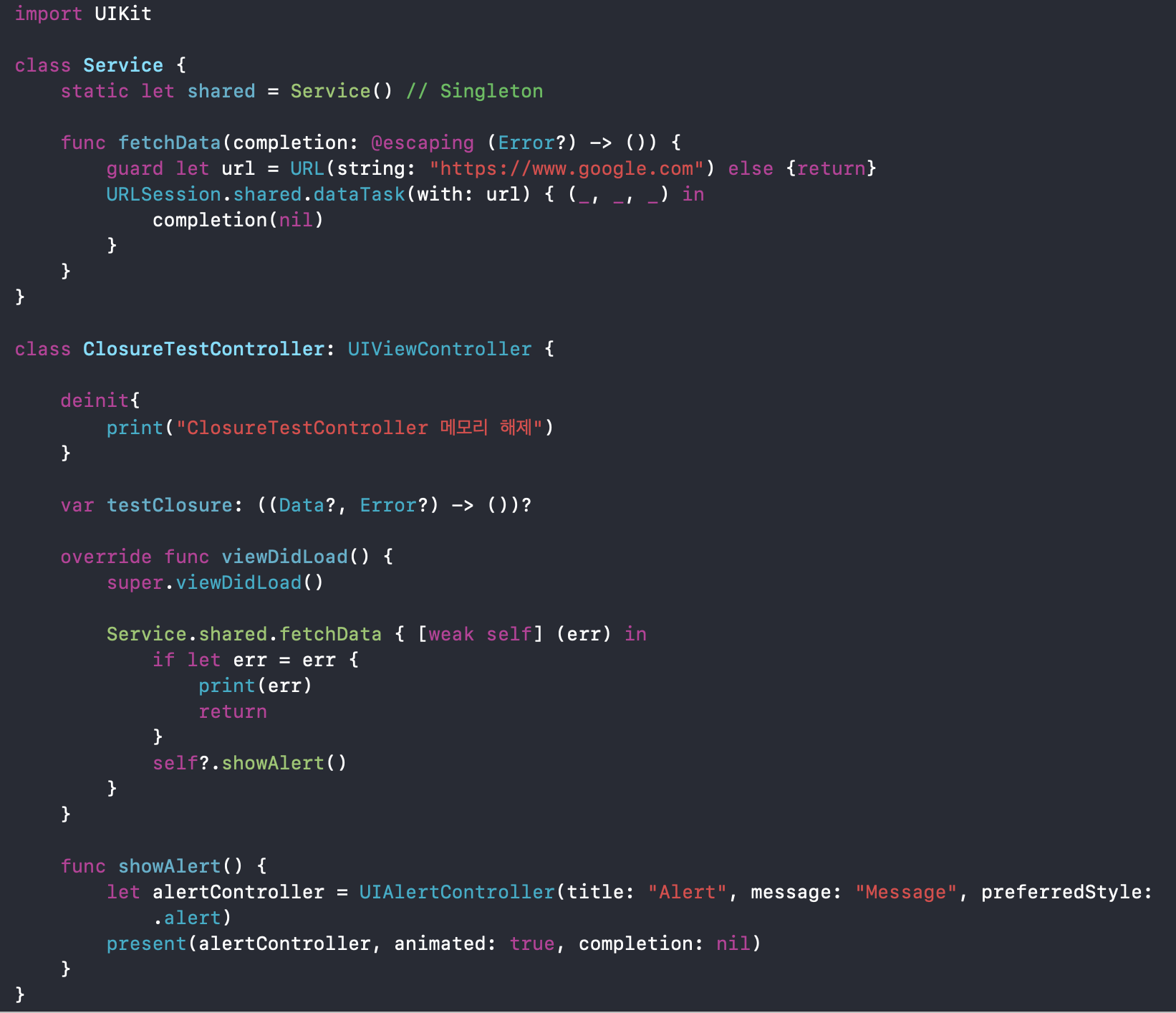 Ex) 다음과 같이 어떤 Service라는 Class가 있고 싱글턴 패턴으로 사용하려 합니다. (메모리에 계속 남아 있겠죠?) 이제 ClosureTestController에서 Service의 fetchData 메서드를 사용할 때 자기 자신을 강한 참조로 참조한다면 강한 순환 참조가 생기게 됩니다. 즉, ClosureTestController를 ARC가 알아서 메모리 해제하지 못한다는 거죠.