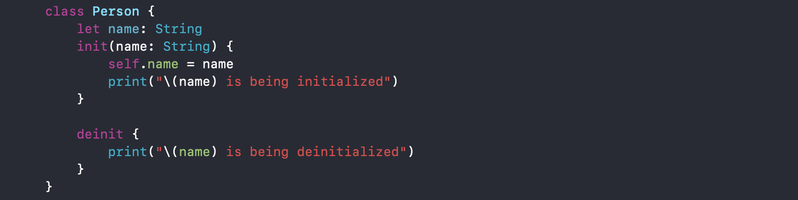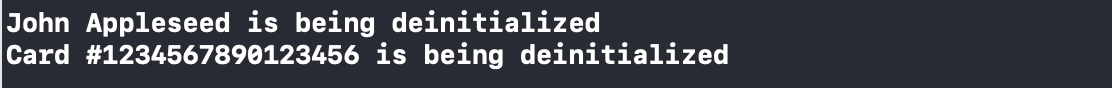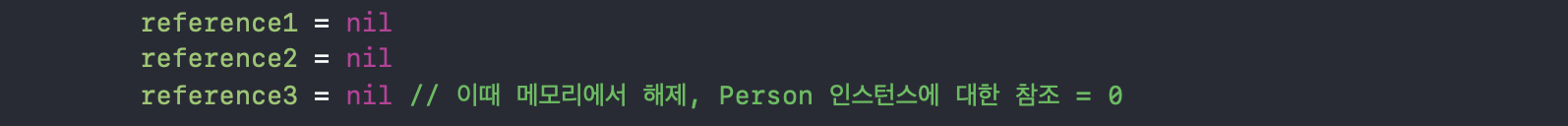 deinit은 메모리에서 해제될 때 실행되게 되는데요. 다음과 같이 Person 인스턴스를 참조하던 변수에 nil을 입력하게 되면 참조 횟수가 1 줄어둘게 되고, 참조 횟수가 0이 되었을 때 메모리에서 Person 인스턴스가 해제되면서, deinit이 호출 됩니다. 여기서 deinit메서드 안에 print를 찍어봄으로써 실제로 메모리에서 해제되었는지 확인해볼 수 있습니다.