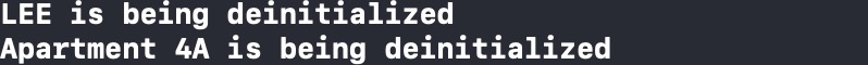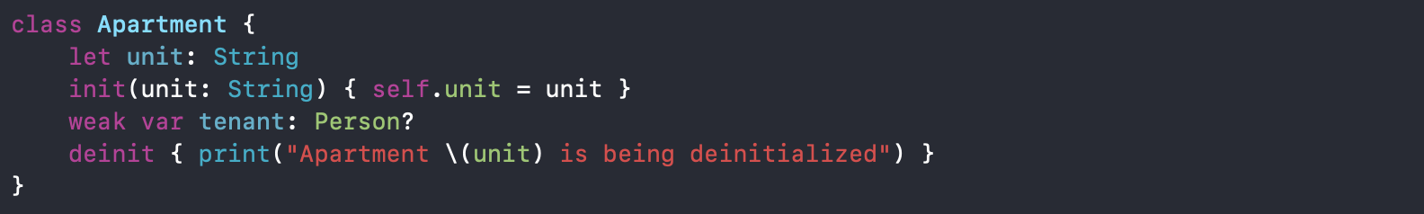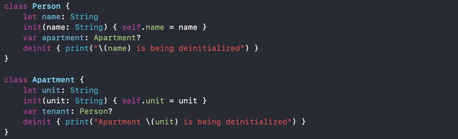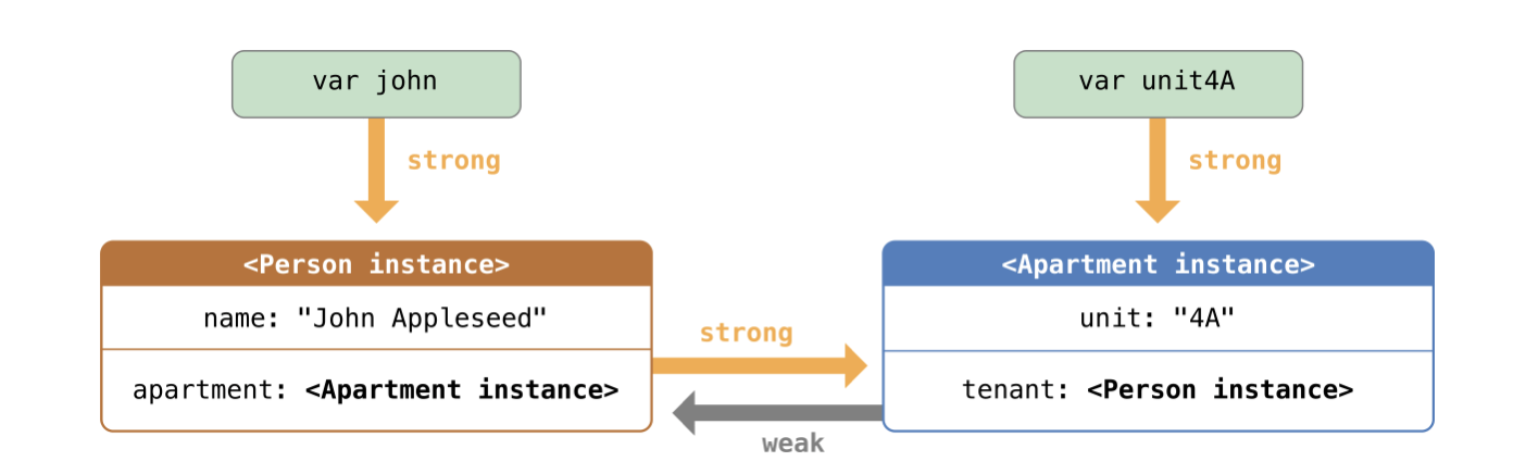 위의 강한 참조가 발생하는 예제에서 다음과 같이 var tenant: Person?를 weak var tenant: Person? 으로 바꿔줌으로써 강한 참조 사이클로부터 벗어날 수 있습니다.