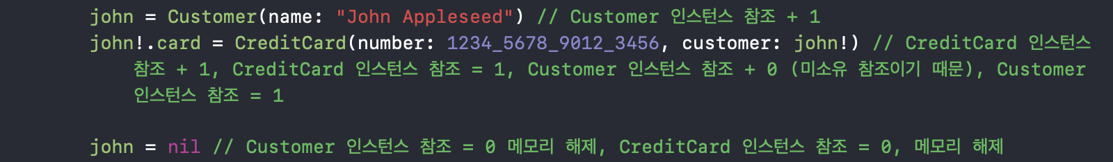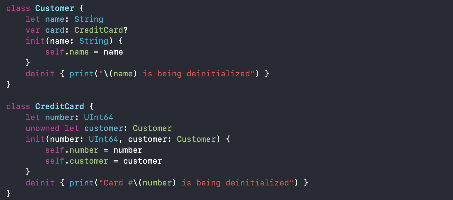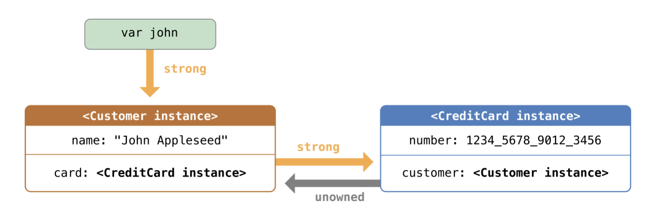 아까 미소유 참조의 경우 다른 인스턴스의 수명이 같거나 수명이 더 길 때 사용하고 항상 값을 가질 것으로 예상되어야 한다고 했죠? 사용자의 경우 카드를 소지할 수도 안 할 수도 있지만 (즉, 옵셔널로 설정) 카드의 경우 무조건 사용자가 있어야 합니다. (값이 항상 있으므로 Not Optional) 또 위의 경우 Card 인스턴스는 결코 Customer 인스턴스의 수명보다 오래 지속될 수 없습니다. (Customer 인스턴스가 메모리에서 해제될 때 무조건 Card인스턴스 역시 메모리에서 해제되니까요 ㅎㅎ)