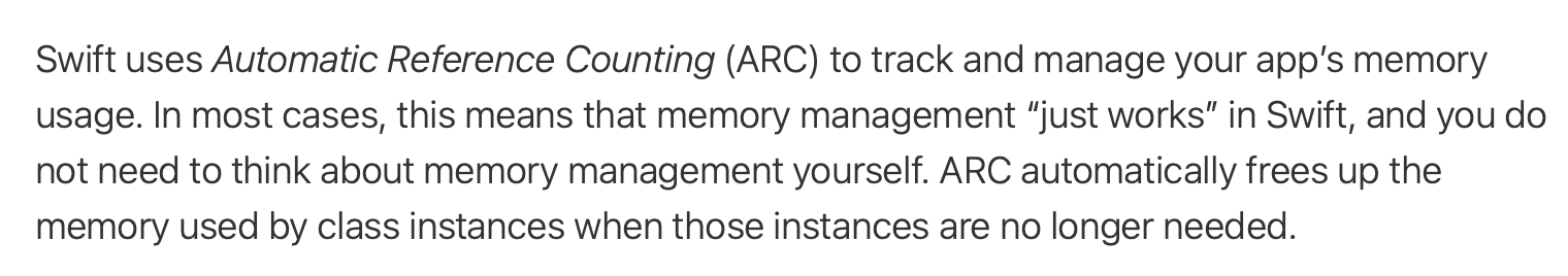자동 참조 계수(Automatic Reference Counting) Swift는 앱의 메모리 사용을 추적하고 관리하는 자동 참조 계수(ARC)를 사용. 대부분의 경우에 메모리 작업은 잘 작동하며, 메모리 관리를 생각할 필요 없다.