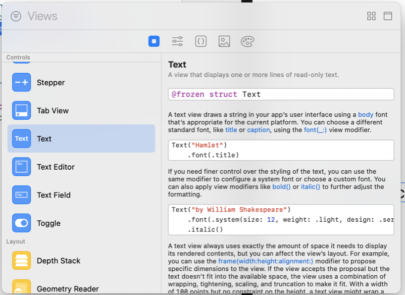 다음과 같이 코드상에서 Command 버튼을 누른 상태에서 Text를 클릭해보면 다음과 같이 popover가 뜰 텐데요. 뭐가 많죠..?