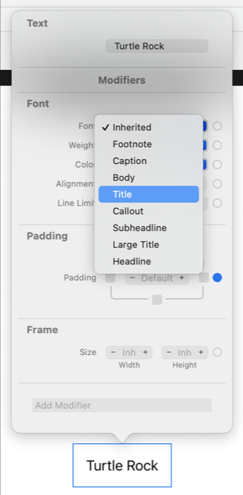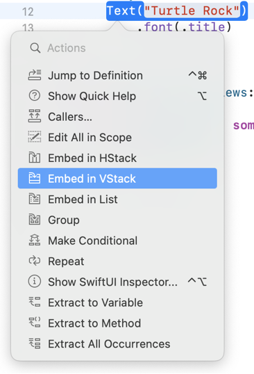 그럼 Text가 Vstack으로 감싸 질 거예요. 그다음에 Xcode 우측 상단 + 버튼을 눌러 Text를 "Turtle Rock"텍스트 바로 아래 드래그합니다. (그럼 코드가 자동으로 생성될 거예요)