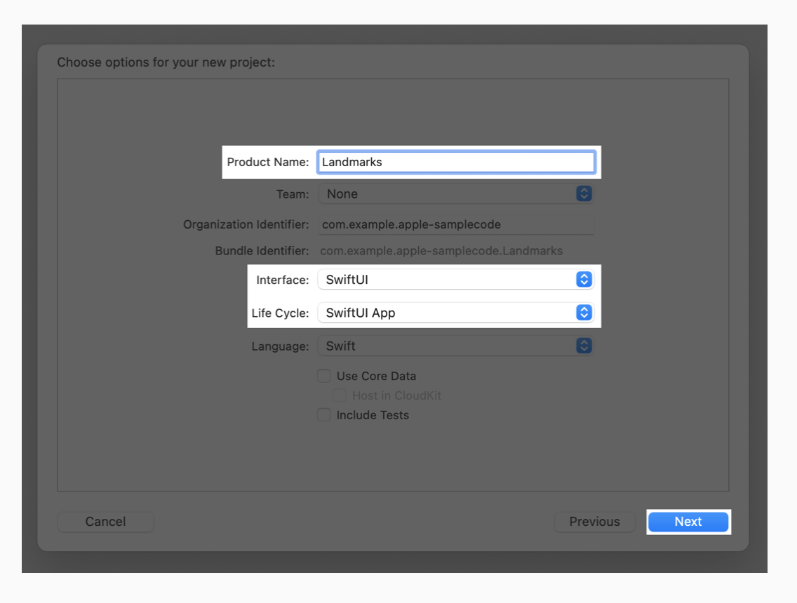 먼저 실습을 위해 프로젝트를 생성해야겠죠? 우리가 보통 프로젝트를 생성할 때랑 약간 차이가 있습니다. 프로젝트 생성 시 다음과 같이 인터페이스와 라이프사이클을 SwiftUI로 설정해야 합니다.