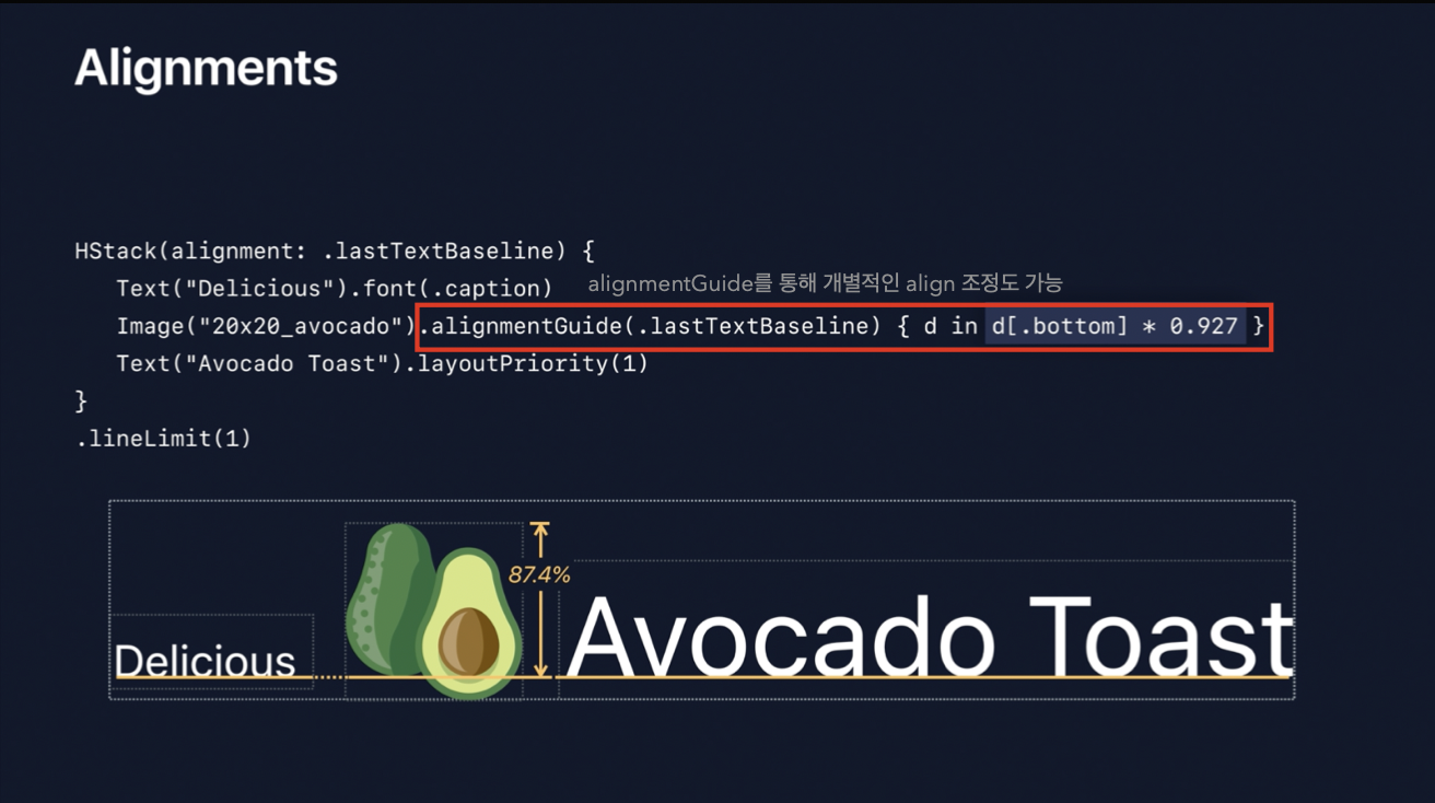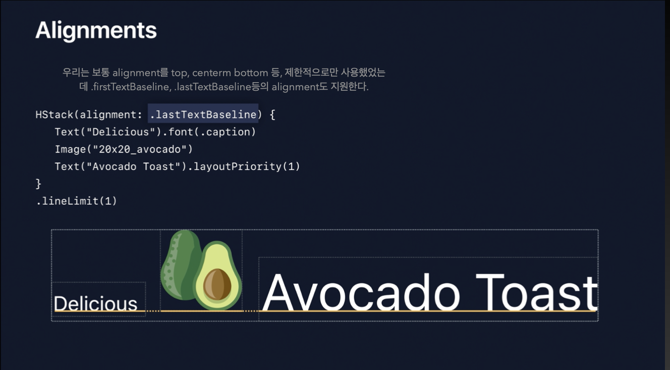 alignment(정렬)에서도 단순히 center, top, bottom 뿐만이 아니라 여러 옵션을 제공해주는데요. HStack을 기준으로는 firstTextBaseLine, lastTextBaseLine 등을 제공해줍니다. (alignmentGuide를 통해 세세한 조정도 가능)