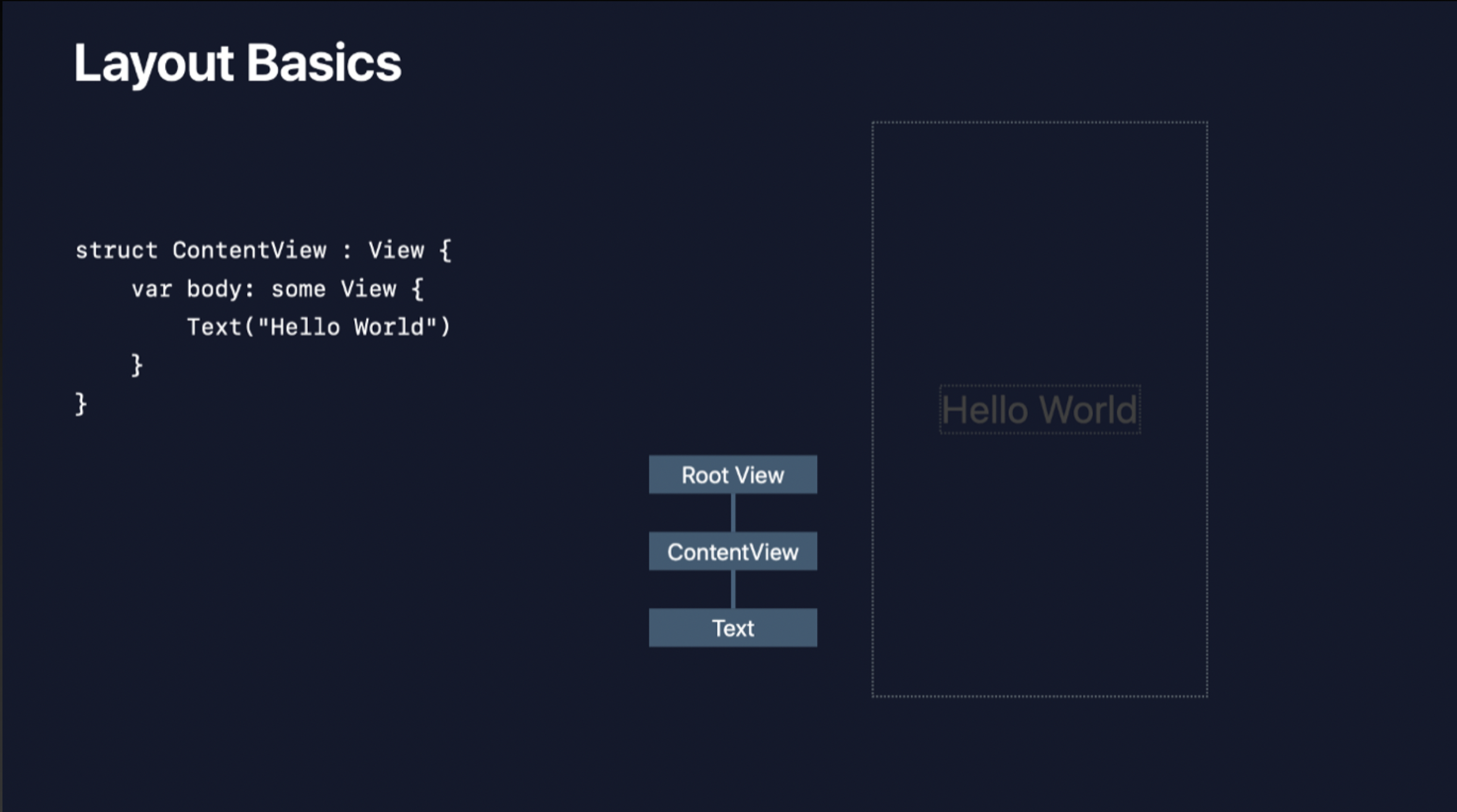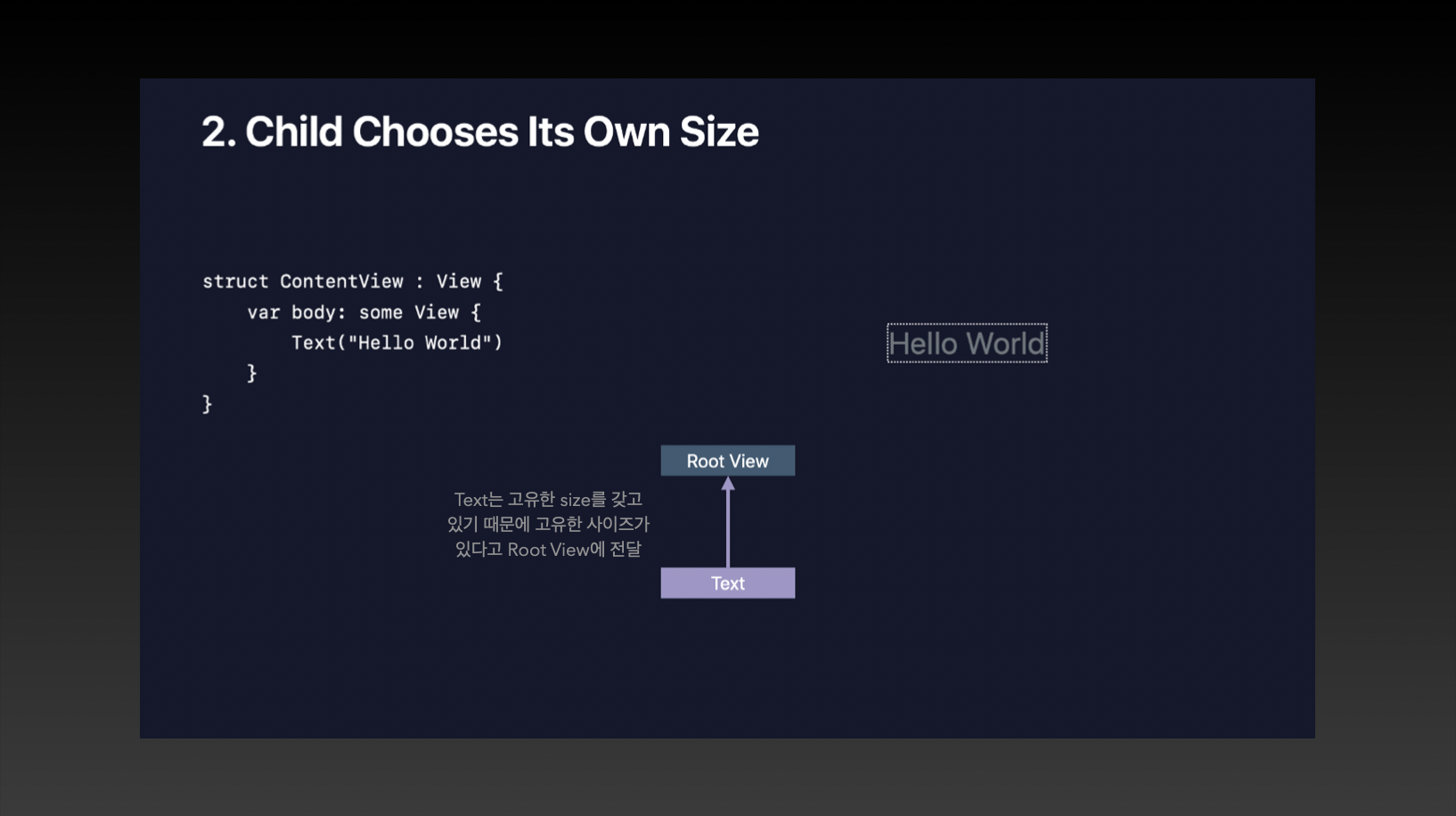 ContentView의 경우 body와 동일한 bounds를 갖기 때문에 단순히 RootView와 Text만을 놓고 생각해 본다면