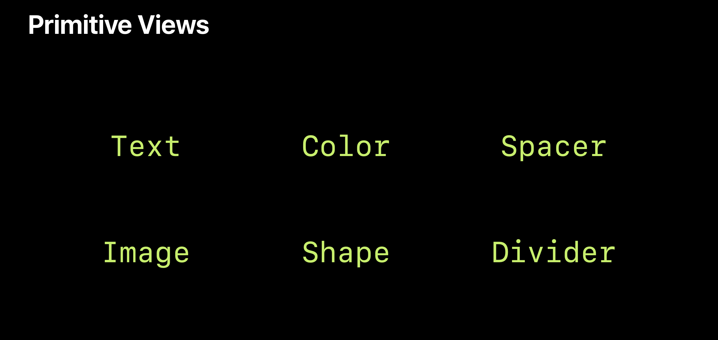 SwiftUI View 역시 마찬가지입니다. SwiftUI의 Primitive Views라 불리는 뷰들은 Body 타입이 View가 아닌 Never 타입이고 이 Never를 만나게 되면 재귀가 종료 되게 됩니다. Primitive Views에는 아래와 같이 Text, Image, Color 등이 있습니다.