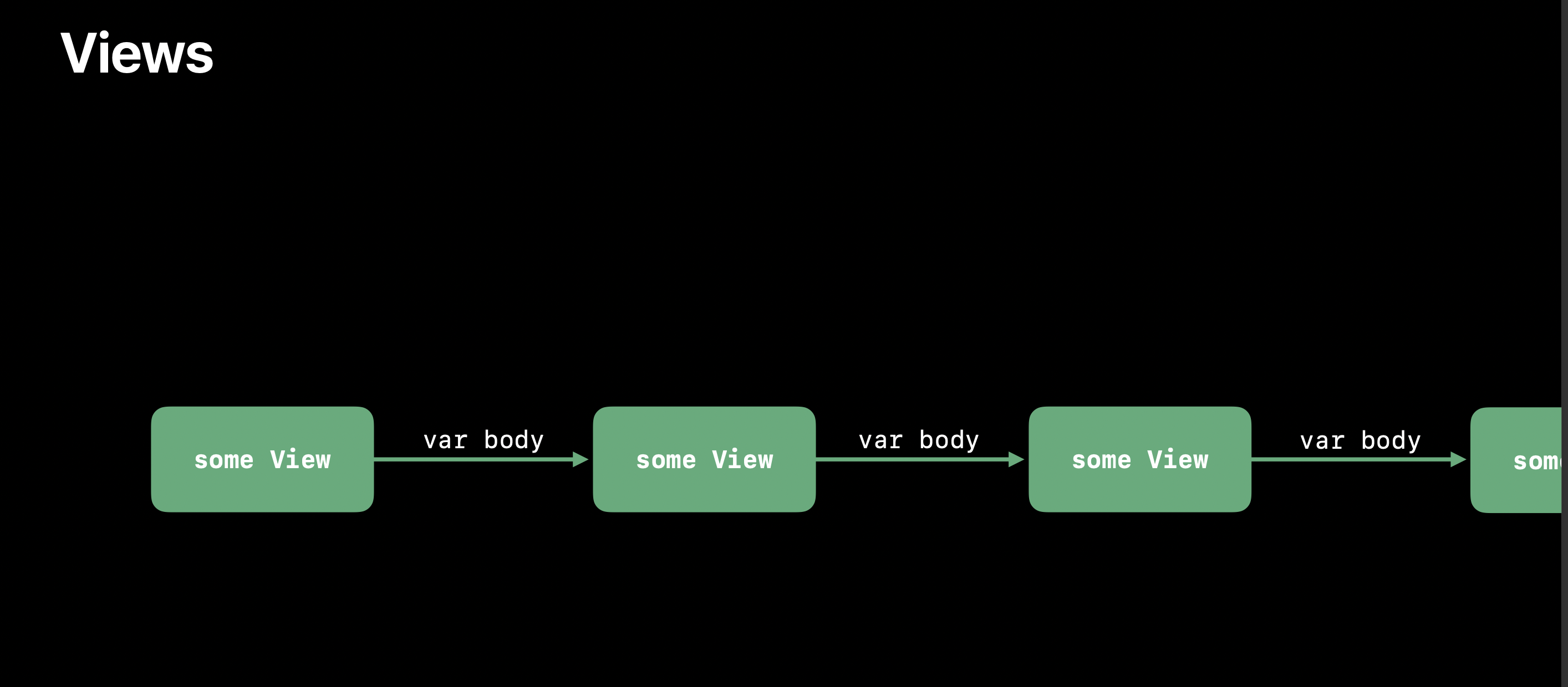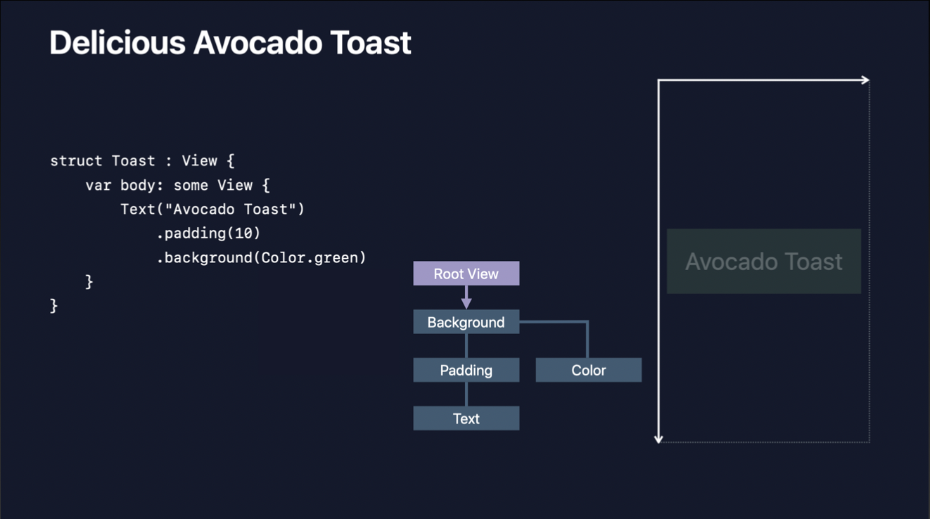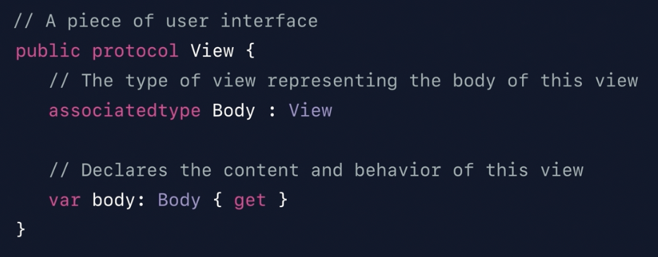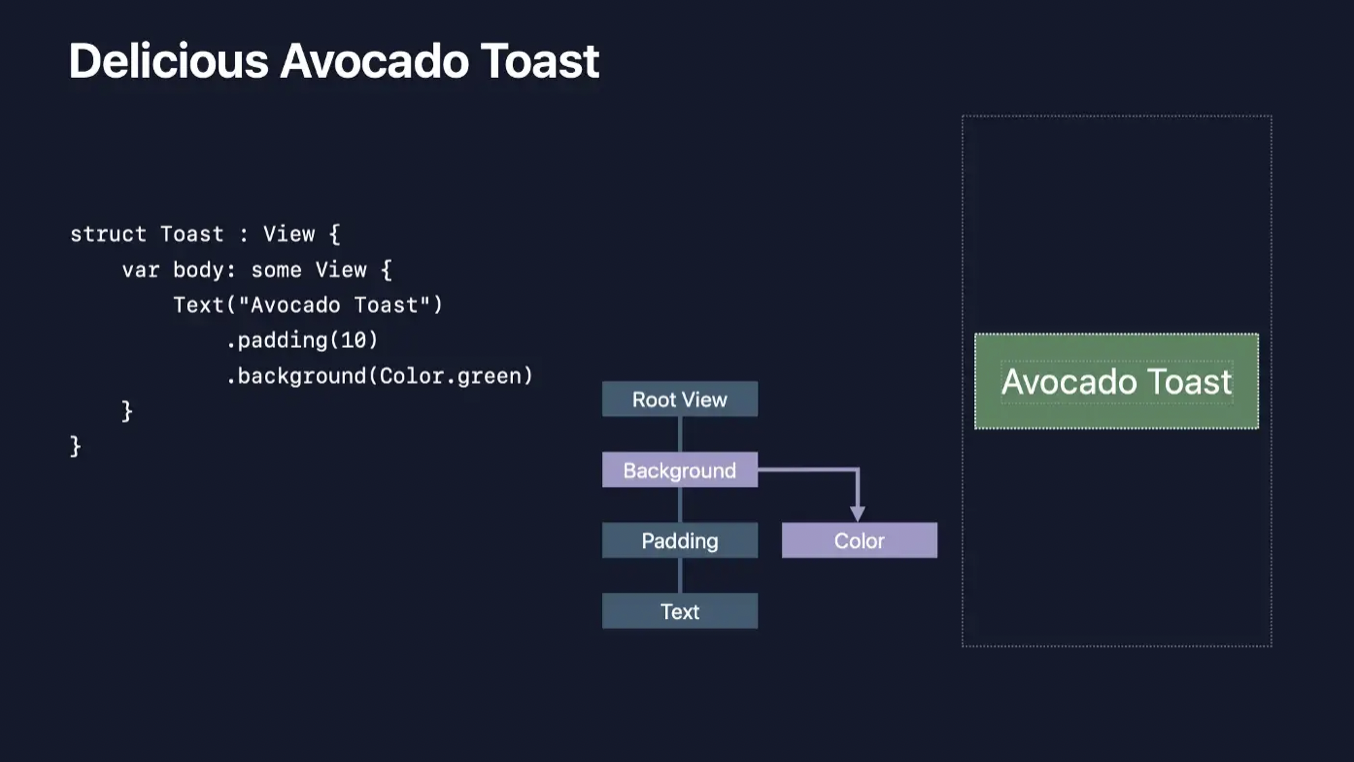 반면, SwiftUI View는 프로토콜 타입이고, 커스텀 뷰를 만들기 위해 상속을 받을 필요가 없습니다. 뷰에 적용하고자 하는 특성을 modifier를 사용해 적용하고 modifier는 고유한 뷰를 반환합니다. 그렇기 때문에 뷰의 고유 특성에 대해서만 storage를 갖게 되고, 그 결과 매우 가볍고 효율적입니다. (UIView 상속처럼 공통 탬플릿을 제공할 필요가 없음)