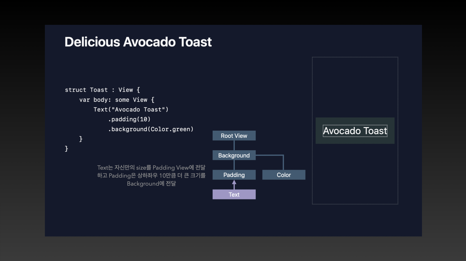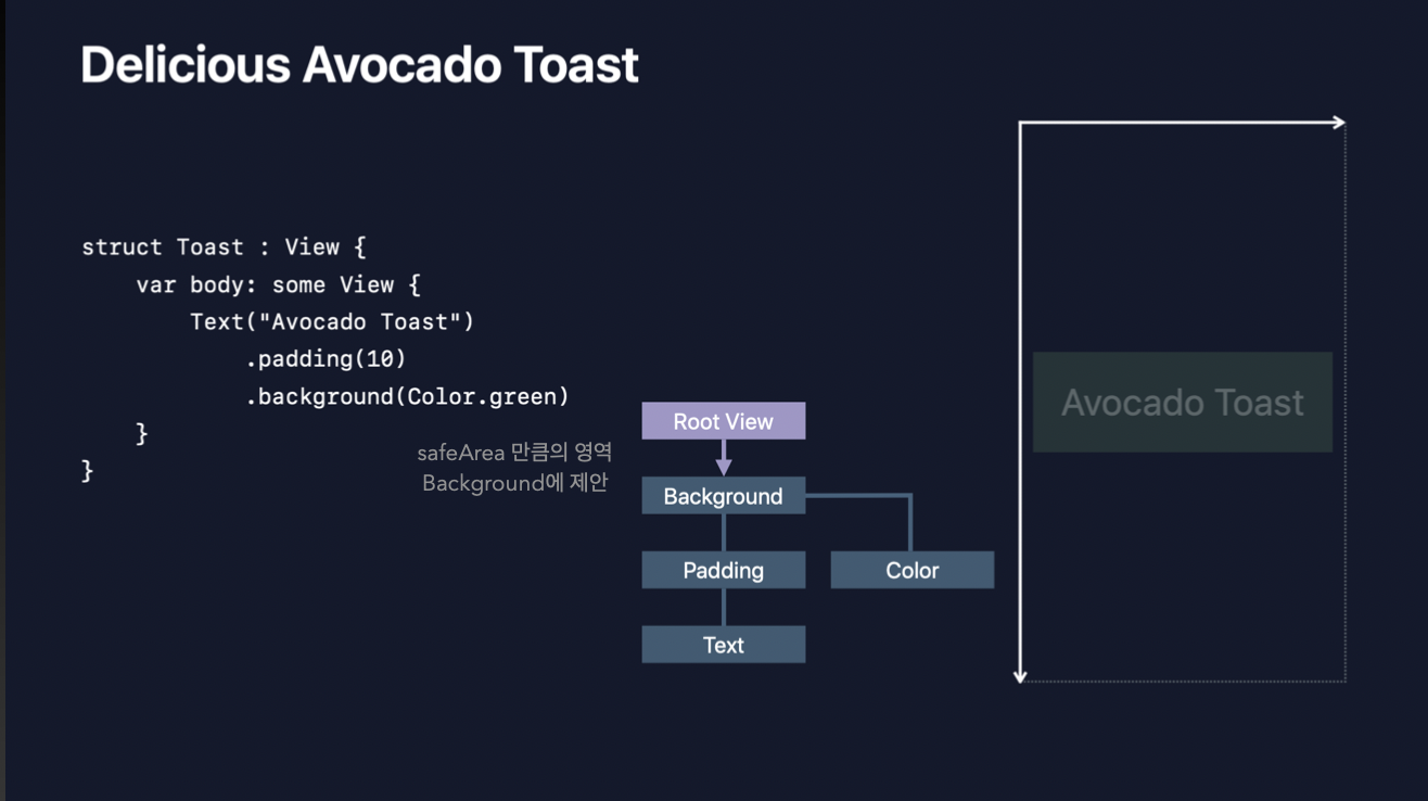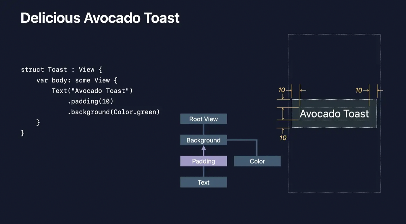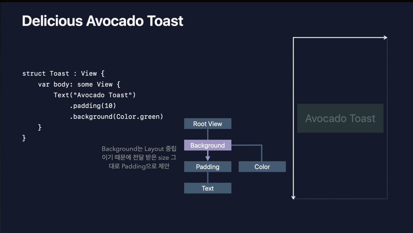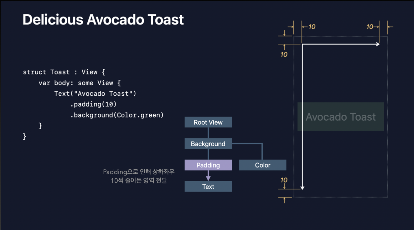 Padding 뷰는 자식 뷰 side에 10 point씩 더할 것을 알고 있기 때문에, 상하좌우 10포인트씩 적은 영역을 Text에 전달합니다. (이렇게 줄어든 영역을 전달하는 이유는, 줄어든 영역을 기준으로 레이아웃이 잡혀야 패딩을 넣을 공간이 생기기 때문입니다. 만약 Avocado Toast 텍스트가 10 point씩 줄어든 레이아웃이 아닌 RootView 레이아웃 기준으로 그려지고 그 너비가 같다면 패딩을 넣을 공간이 없잖아요? 즉, 애초에 패딩 넣을 공간을 남겨두고 영역을 전달한다고 보시면 됩니다.)