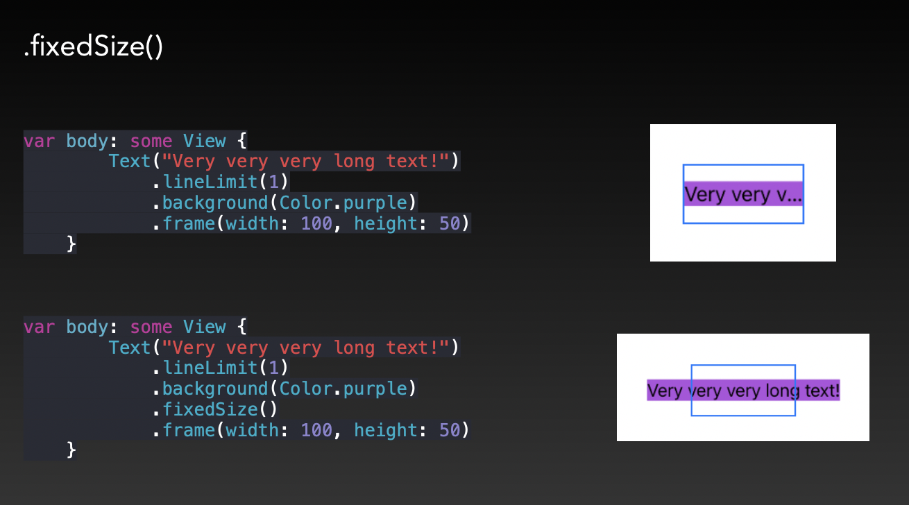 Text 역시 마찬가지입니다. 부모 뷰의 공간과 관계없이 자신의 이상적인 크기를 모두 표현하려면 fixedSize() modifier를 사용해야 하죠