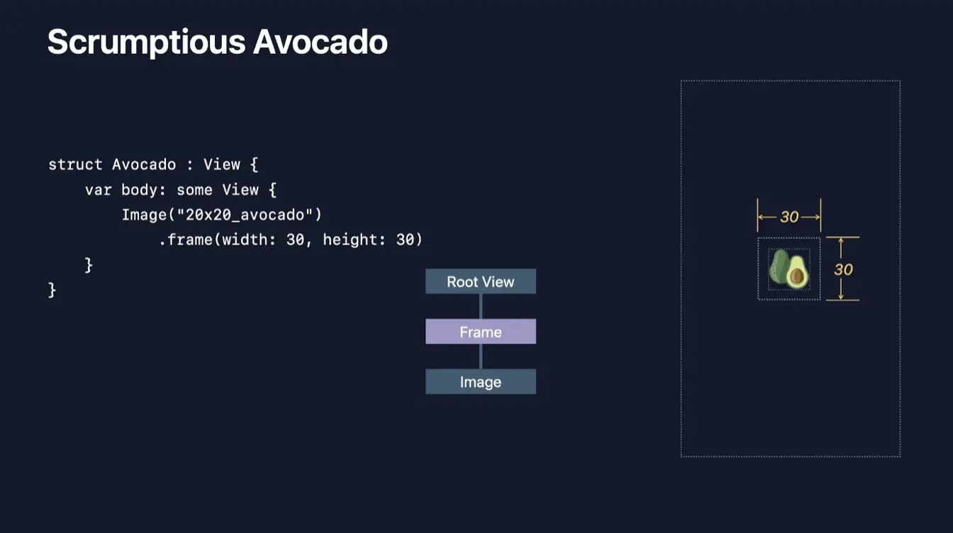 만약 20x20 사이즈의 아보카도 이미지가 있고, 30x30의 frame을 주었다면, 아래와 같이 30x30 액자 안에 20x20 아보카도 이미지가 들어있는 모습을 생각해야 합니다. (resizable modifier를 사용하지 않았을 경우)