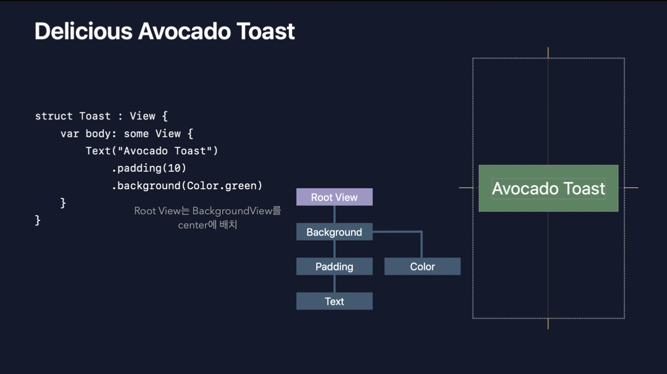 Background View는 Text 사이즈에 패딩이 상하좌우 10 Point 씩 들어간 크기를 Root View로 전달하고, Root View는 이 뷰를 SafeArea영역 가운데에 배치하게 됩니다.